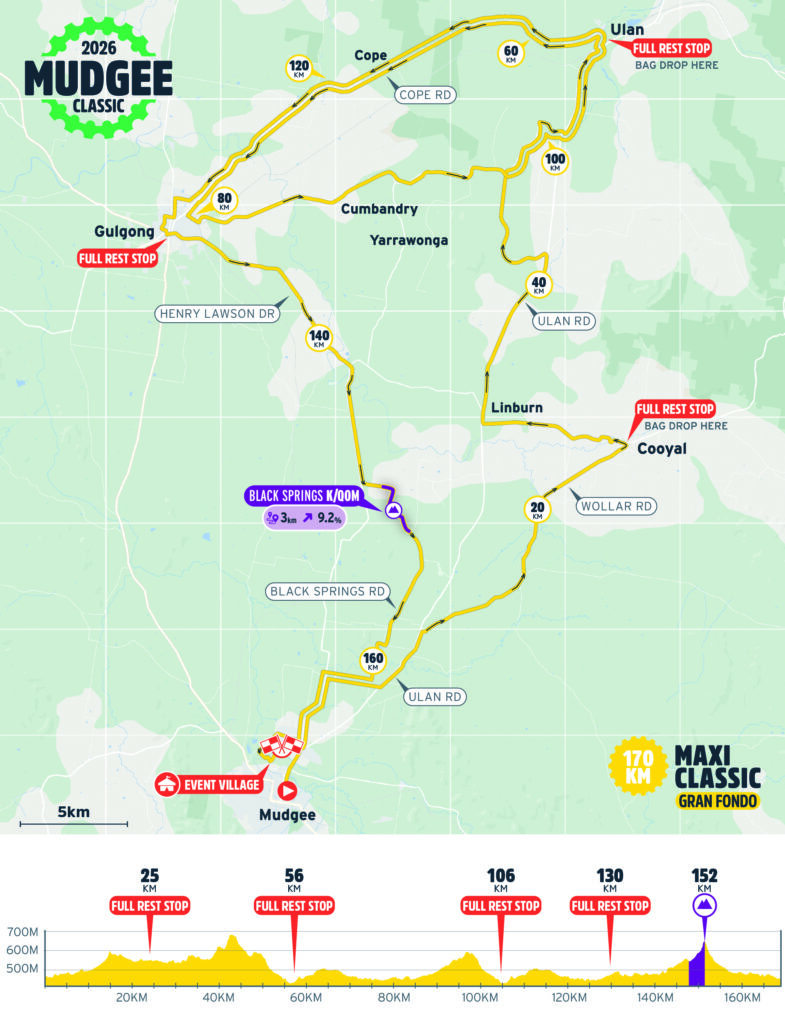 The 170km Maxi Classic is the ultimate Mudgee challenge, taking riders through stunning countryside, rolling hills, and quiet rural roads. Starting in Mudgee, riders will pass through towns like Gulgong, Ulan, and Rylstone, experiencing plenty of elevation and sweeping views. This course is designed for experienced cyclists looking for a rewarding and unforgettable ride through one of NSW’s most picturesque regions.
